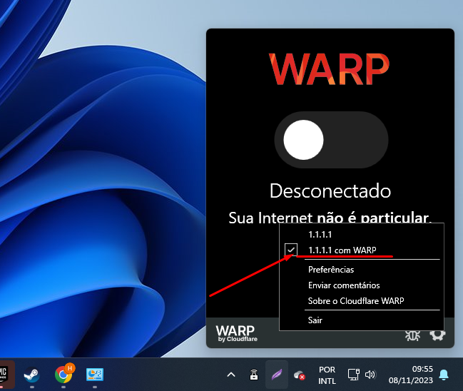 7️⃣ Certifique-se de que está ativado o modo **WARP (não apenas DNS 1.1.1.1)** — você pode alterar clicando na engrenagem ⚙️ > "Modo de conexão".
